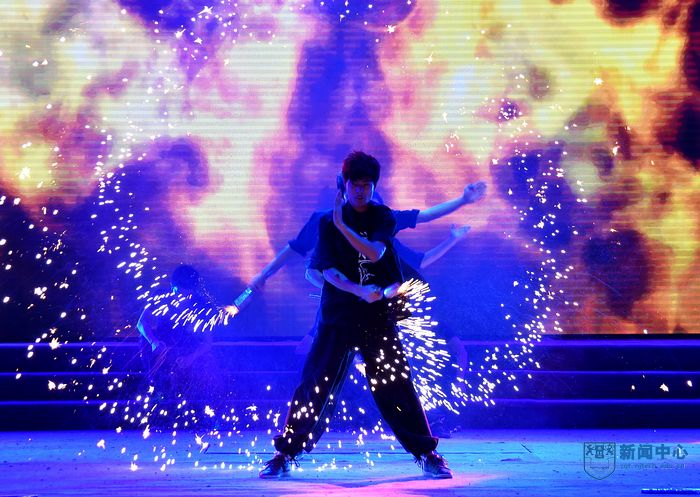 唱青春赞歌,与梦想同行。伴随着校大学生艺术团管乐团的一曲雄浑的《世纪序曲》,整场晚会在绚丽的灯光中拉开帷幕。悠扬的音乐慢慢响起,屏幕上渐渐浮现出一幅幅由艺术学院学生带来的原创沙画,音诗画表演《追寻》寓意着南工百年发展的辉煌历程,栩栩如生的沙画配合大学生艺术团舞蹈团成员们的曼妙舞姿,美轮美奂。26面院旗飘扬舞动,昭示着百年名校的追寻之路。由全国大学生龙狮大赛亚军获得者校龙狮队表演的《盛世欢腾》鼓乐震天、龙腾狮跃,寓意发展中的南工正如一条腾飞着的巨龙,以江苏先进生物与化学制造协同创新中心和海外人才缓冲基地建设为引擎,在“综合性、研究型、全球化”大学的新征程中翱翔九天。一曲《祖国,我的爱恋》展现了南工人心系祖国、南工梦助力中国梦的爱国情怀。即将赴“孔子学院”全球文化巡演的精彩节目武术舞蹈《对弈》充满中国元素,展示出中华文化的博大精深。由2015级新生军训教官带来的合唱《强军战歌》把整场晚会推向高潮,铮铮男子汉,铿锵英雄梦,浑厚的歌声响彻体育馆,也唱进了参加军训的每位新生的心里。