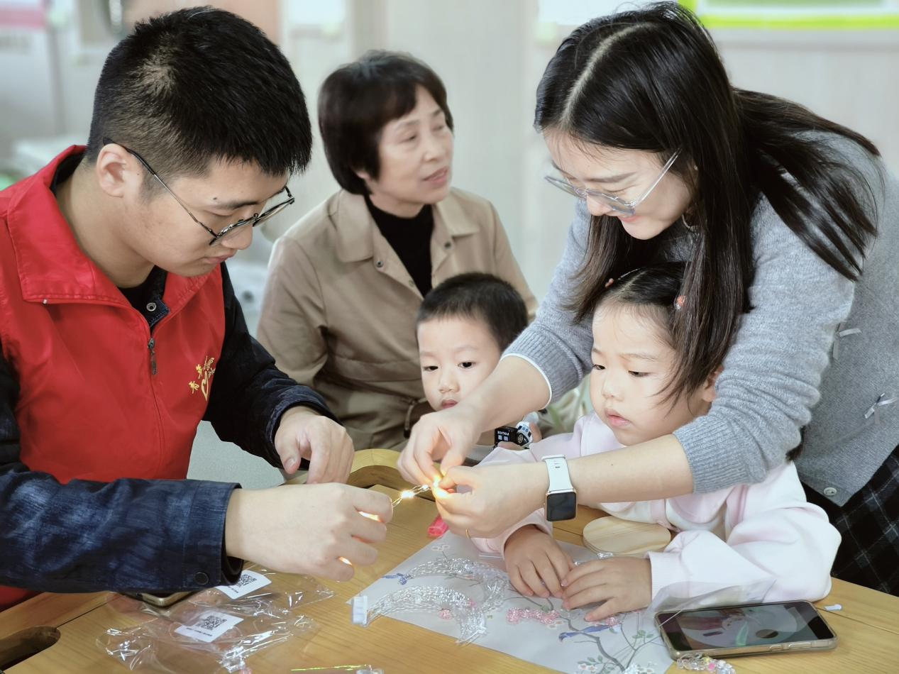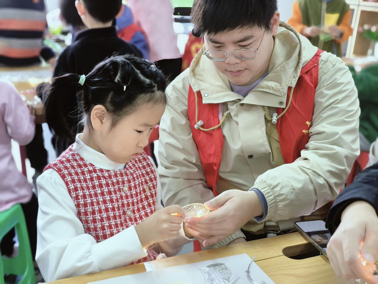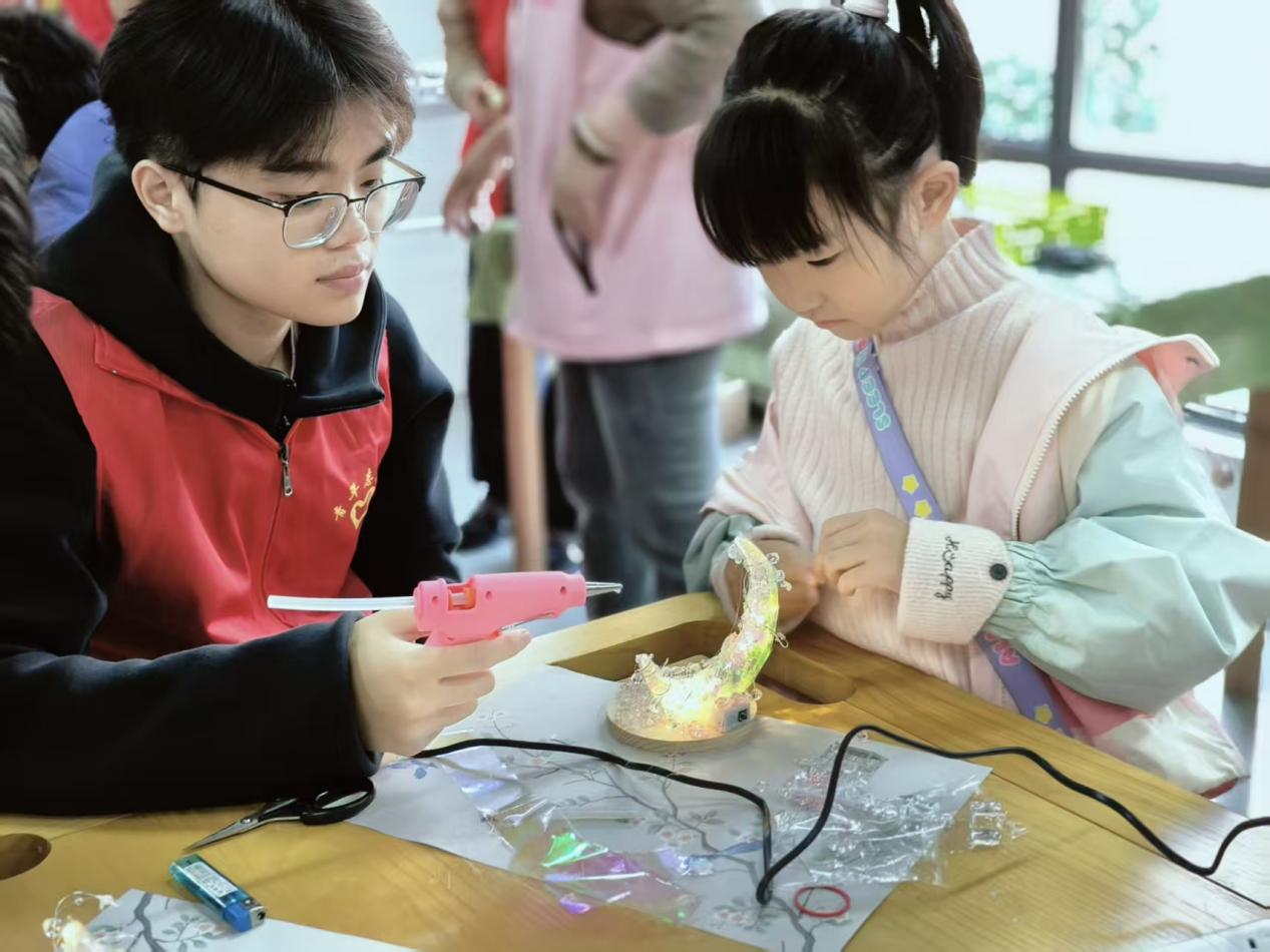活动聚焦社区儿童成长需求,精心设计了“镜中万象 手作焕新”创意手工环节。学生党团员们耐心细致地引导孩子们发挥想象力,运用彩纸、黏土、贴画等材料,动手装饰独一无二的小镜子及其他手工作品。他们俯身相伴,时而讲解步骤,时而协助操作,在亲切互动中不仅传授了手工技巧,更传递了温暖与关爱。一个个普通的胚体,经过孩子们灵巧的双手,变成了色彩斑斓、充满奇思妙想的艺术品。活动现场气氛热烈,成就感与欢声笑语交织,构成了一幅党团同心、服务社群、关爱未来的温馨画卷。