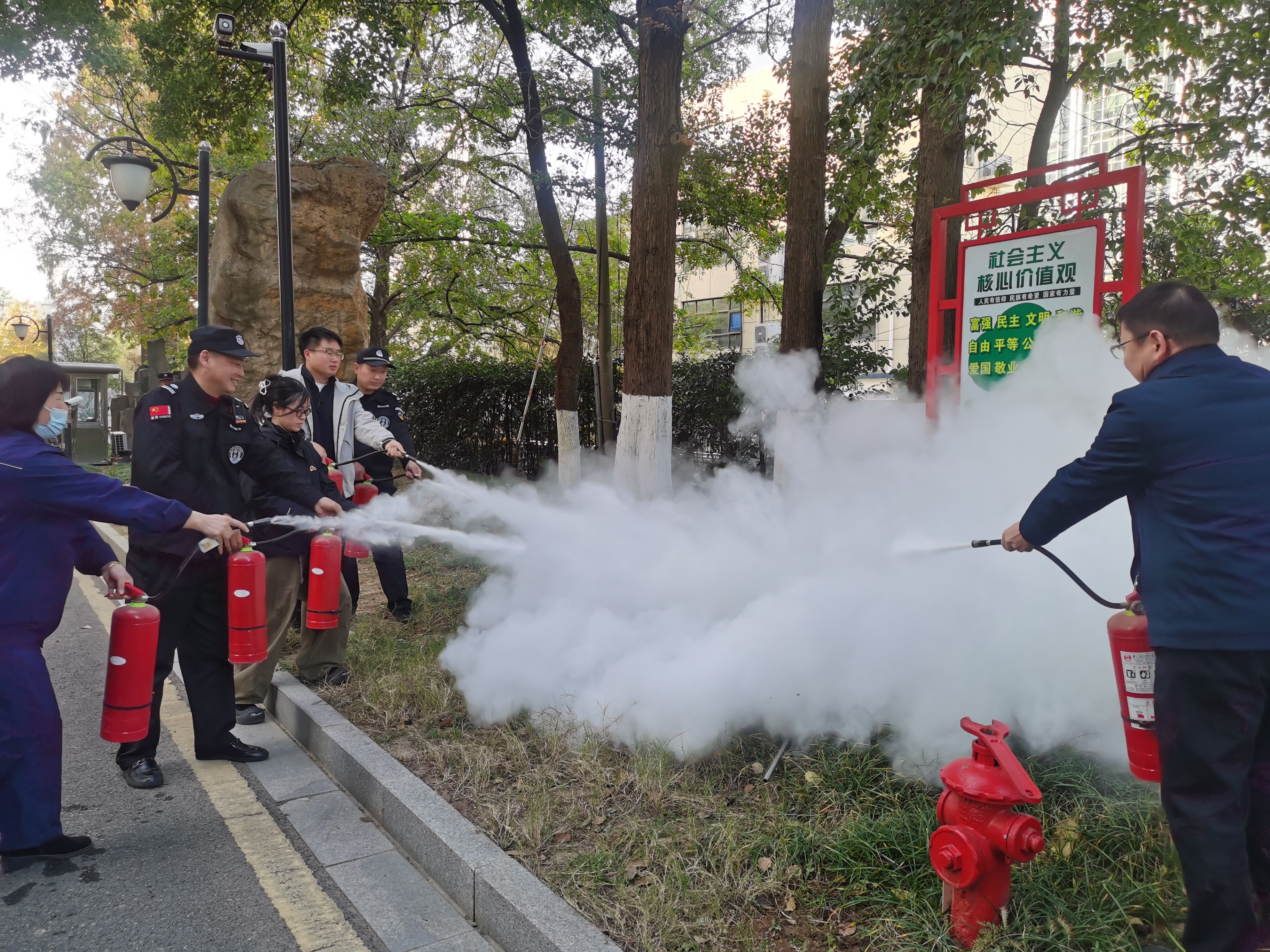 活动中,我院学生代表石东辉从用电管理、设备运行、材料存放等关键环节入手,通过典型案例解析和情景模拟,系统阐述了火灾隐患识别、初期处置及应急响应流程。在随后开展的实操演练环节,党团员们分组示范并指导参训职工进行防毒面具佩戴、消防水带连接、消防防护服穿戴、灭火器操作等技能练习。通过“手把手”教学和“一对一”指导,及时纠正不规范操作,确保每位职工都能掌握正确的应急处置方法。