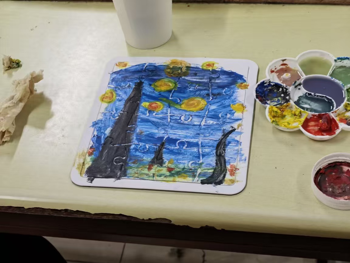 活动伊始,主持人对“色彩大师”这一主题进行了详细介绍,引导同学们发挥想象,用色彩和线条表达内心世界。随后,同学们以空白拼图为画布,拿起画笔,开启了自由创作之旅。现场气氛和谐,大家专注于手中的画作,每一笔都倾注了自己的情感与创意。创作结束后,进入了分享画作环节。同学们依次上台,自信地展示自己的作品,并分享创作背后的故事和感受。活动最后,全体同学共同合影留念,用镜头定格这充满艺术氛围和欢乐的美好瞬间。