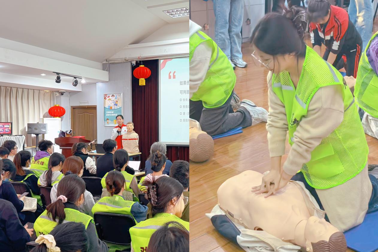 为切实提升研究生群体的应急救护能力,普及心肺复苏(CPR)及自动体外除颤器(AED)的使用知识,进一步筑牢校园安全防线,11月16日,柔性电子(未来技术)学院研究生会与劝业路社区共同举办了“黄金四分钟”急救技能提升培训活动。本次活动采用“理论讲解+实操演练”相结合的方式,系统讲授急救知识与技能,吸引了众多研究生同学积极参与。