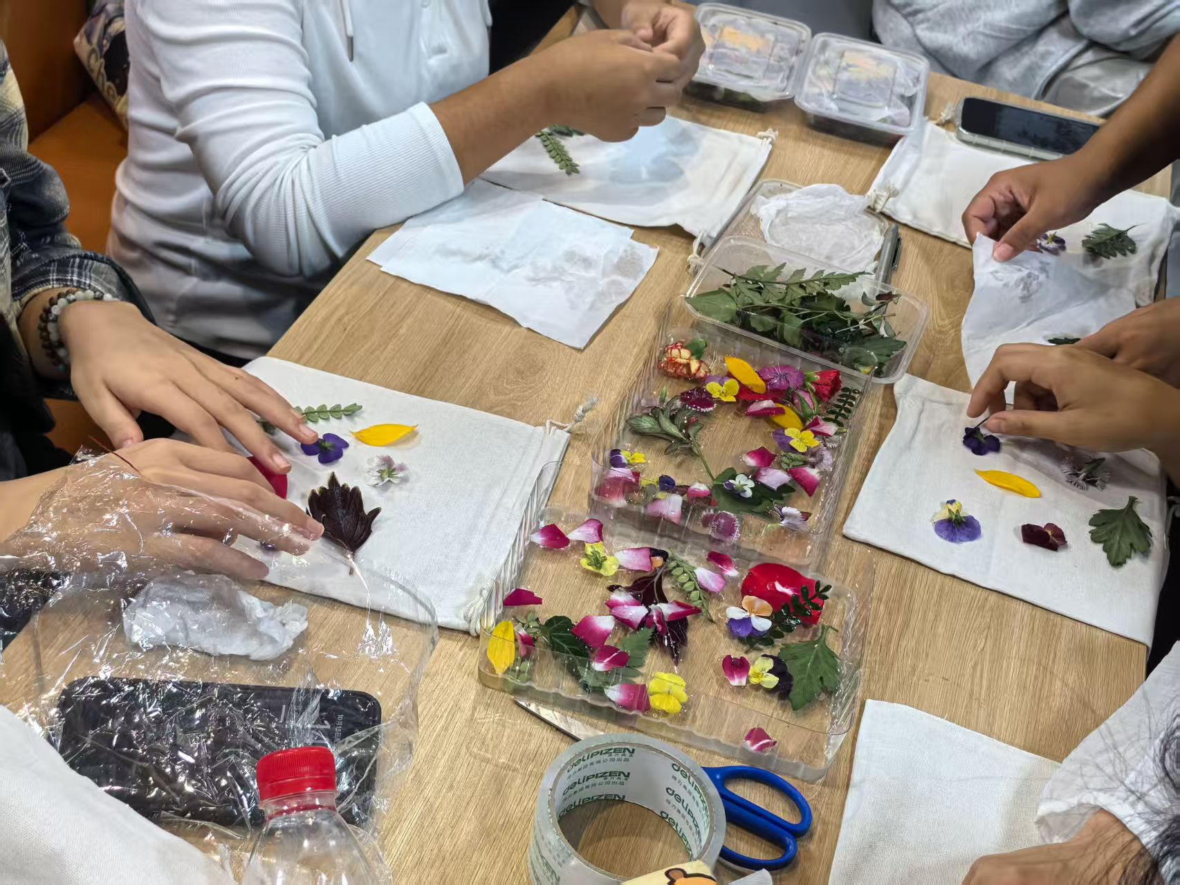 在工作人员的引领下,同学们陆续到来,活动的气氛也达到了高潮。大家三两成行,按照喜好与心情任意选择花瓣、树叶、草木,设计出属于自己拓染布包。贴上胶带、用力捶打,直至颜色浸润布袋。小锤子的叮咚声与大家的欢笑声不绝于耳,心灵的压力与社交的不安在此刻得以释放。