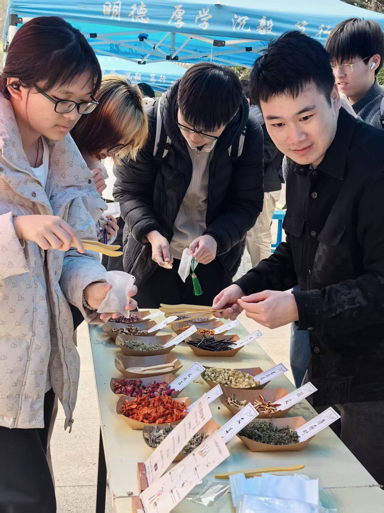 活动现场,学院精心布置了充满春日气息的摊位,准备了薰衣草、玫瑰、薄荷、艾草等十余种的天然香材,以及各式精美绣纹的香囊布袋、五彩流苏等手工材料。同学们围聚桌前,手持木夹,细心称量配比,将混合好的香料填充进香囊内衬,系上挂绳,一个个造型精致、散发着淡雅清香的香囊便制作完成。不少同学表示,亲手制作香囊的过程不仅有趣,还能在慢节奏的手工劳作中平复心绪,而自己调配的香囊也是一份独特的春日纪念。